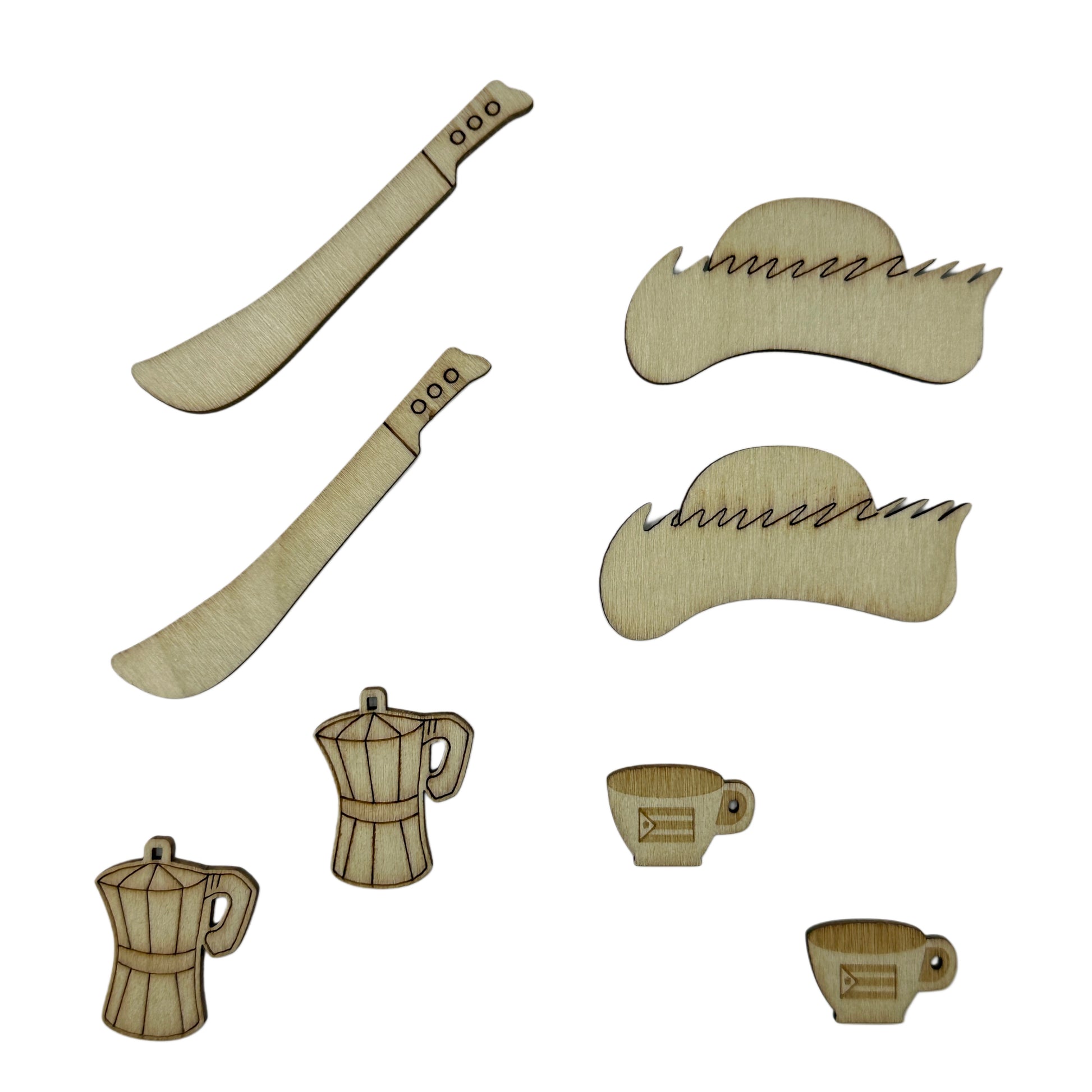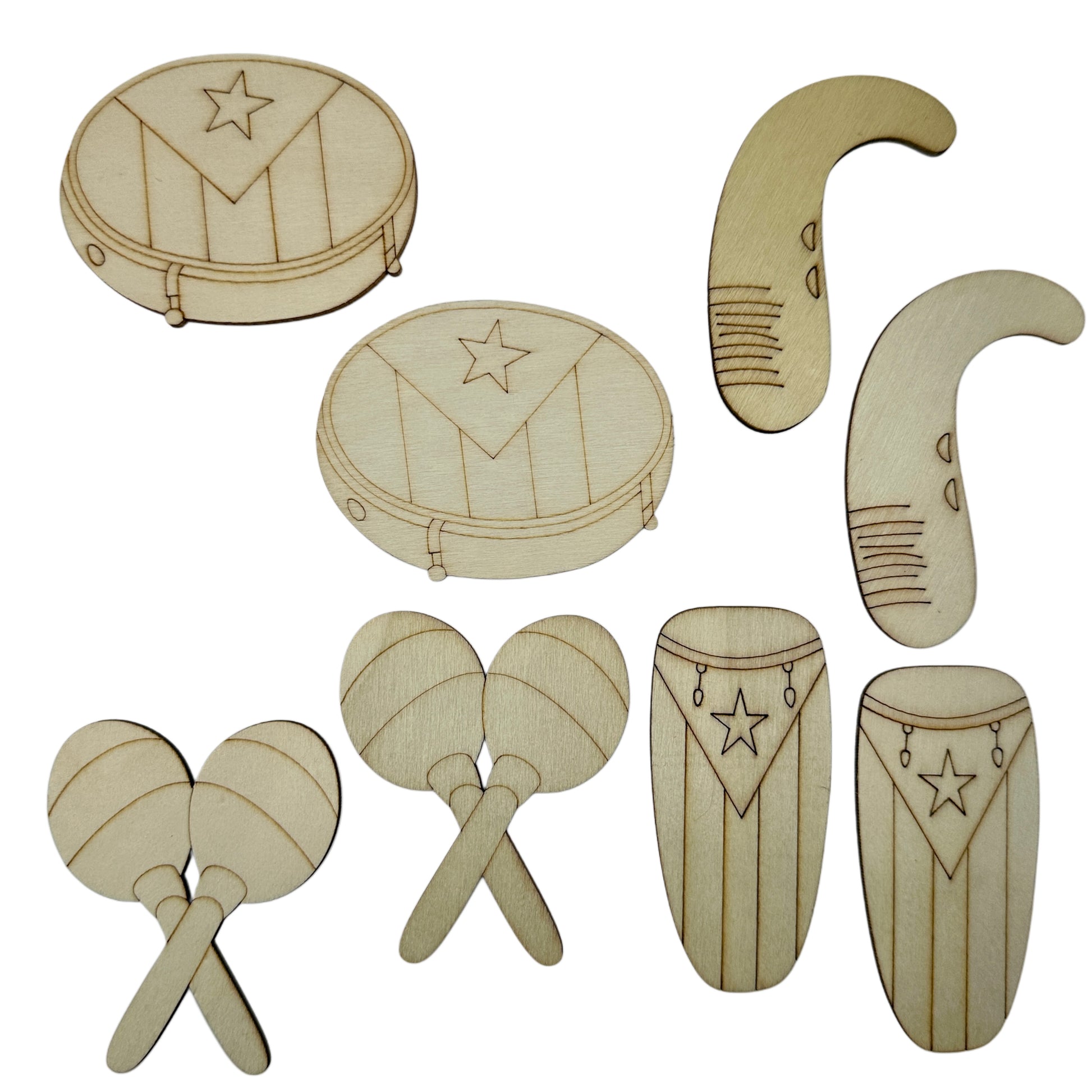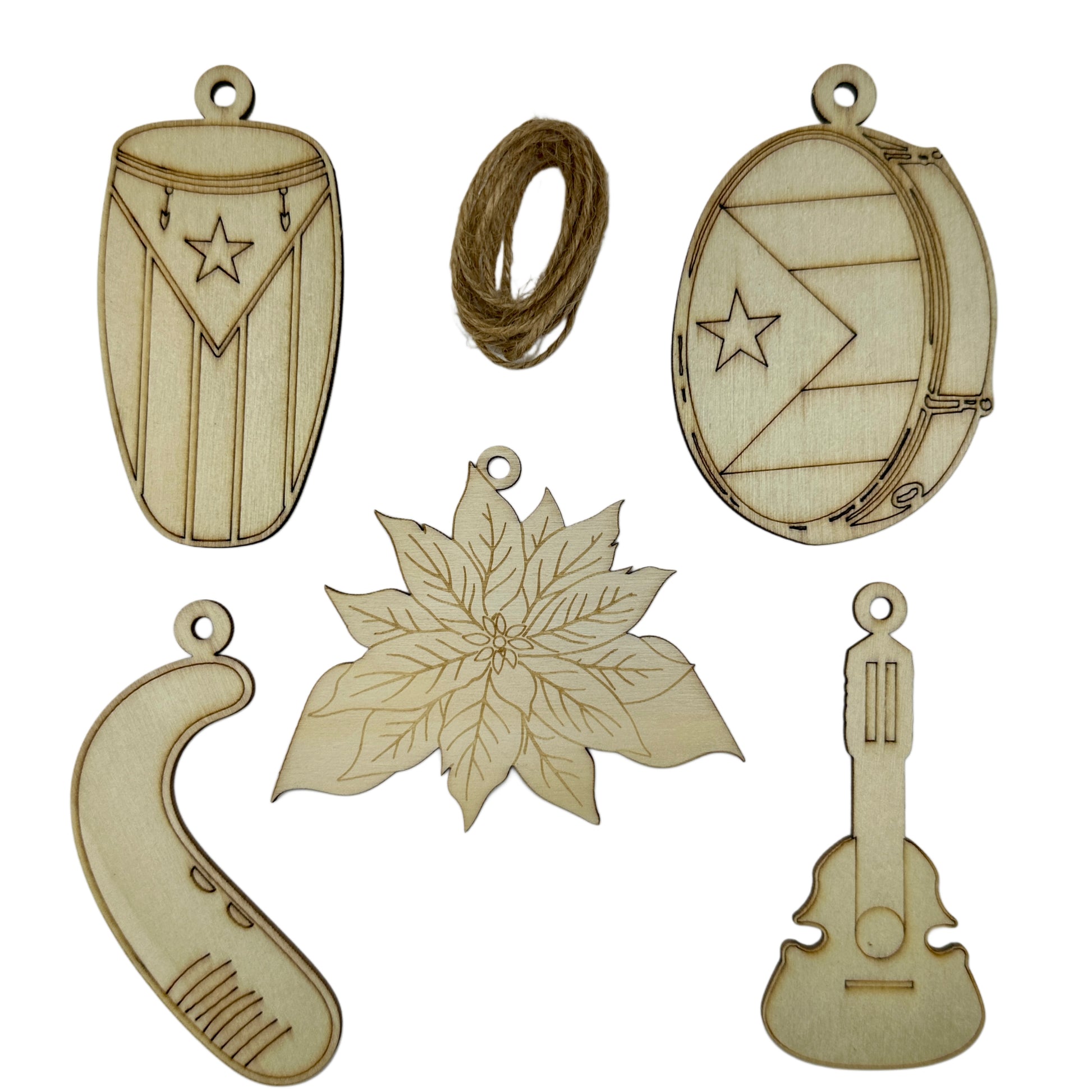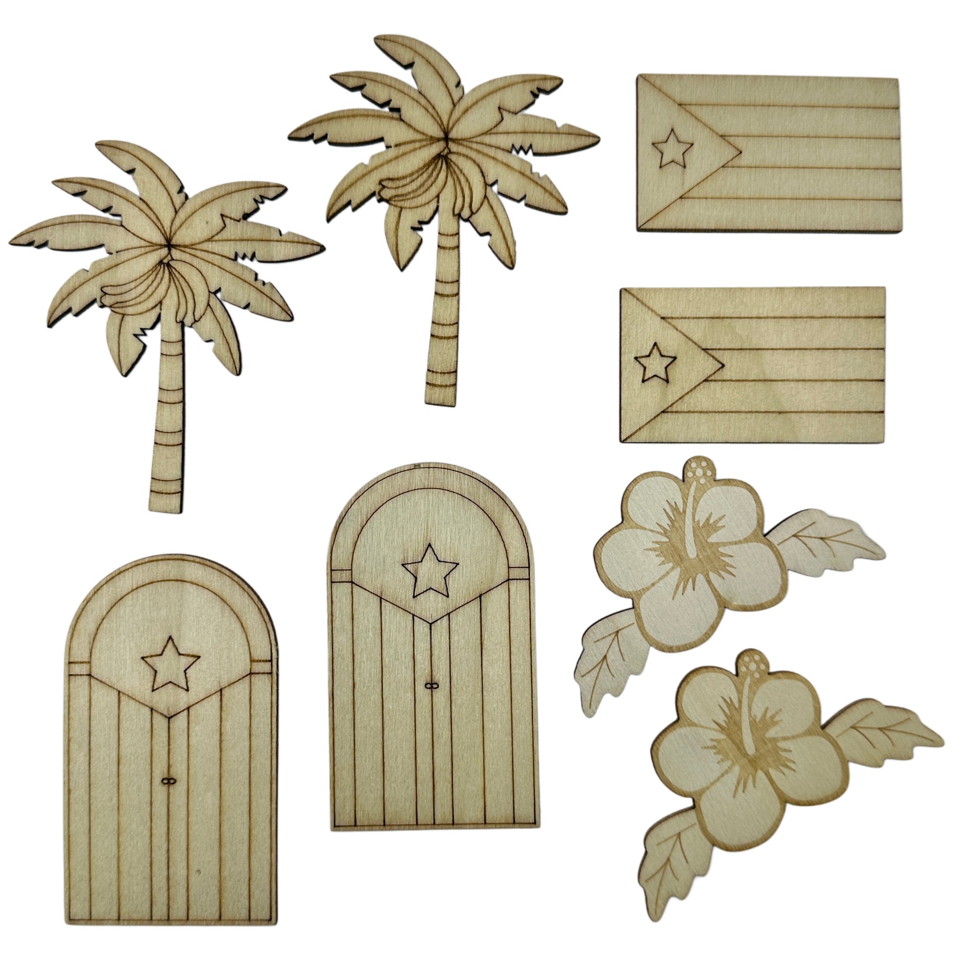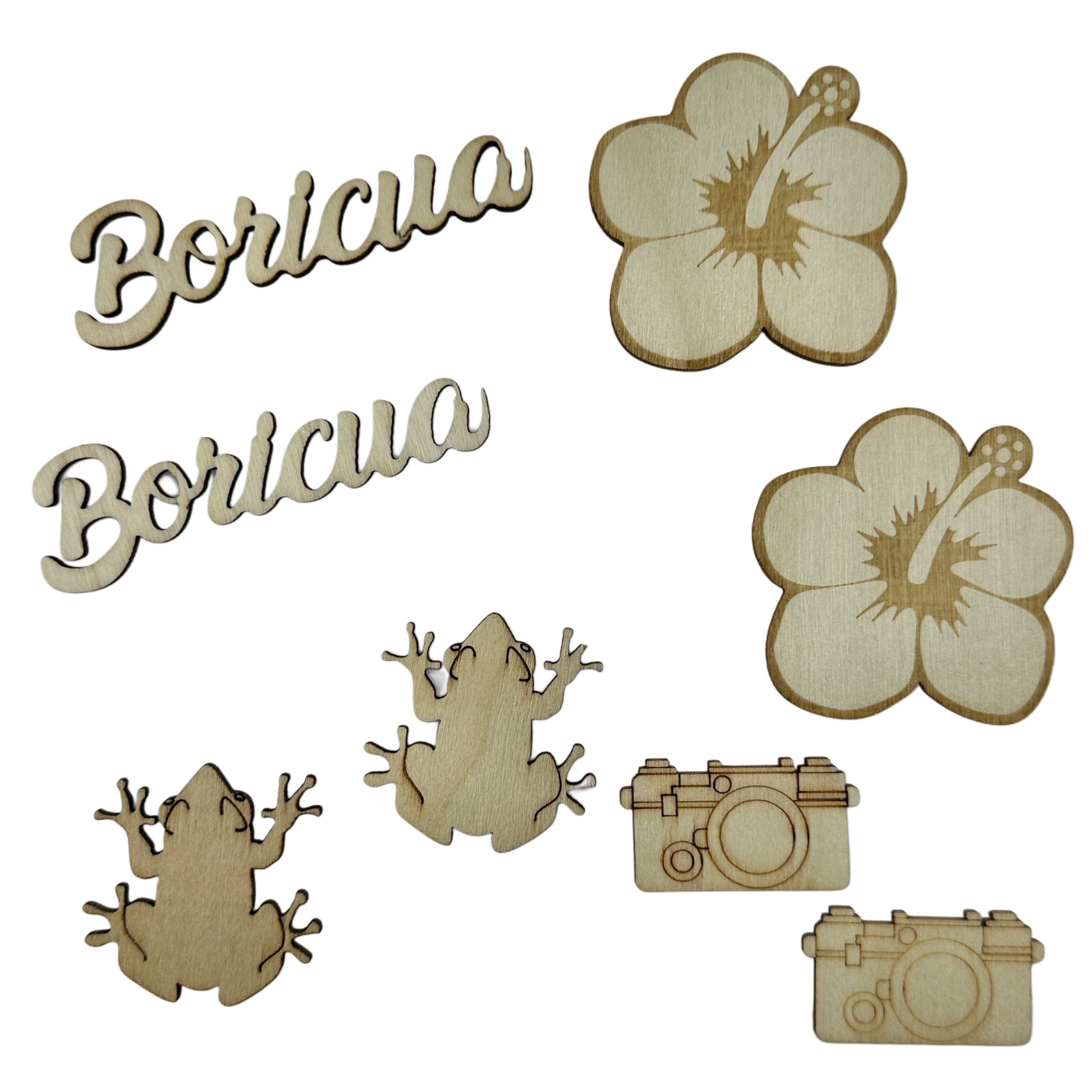 Variedad de modelos de maderas cortadas con diseños de Puerto Rico. Tamaño varian entre 1-3" aproximadamente.