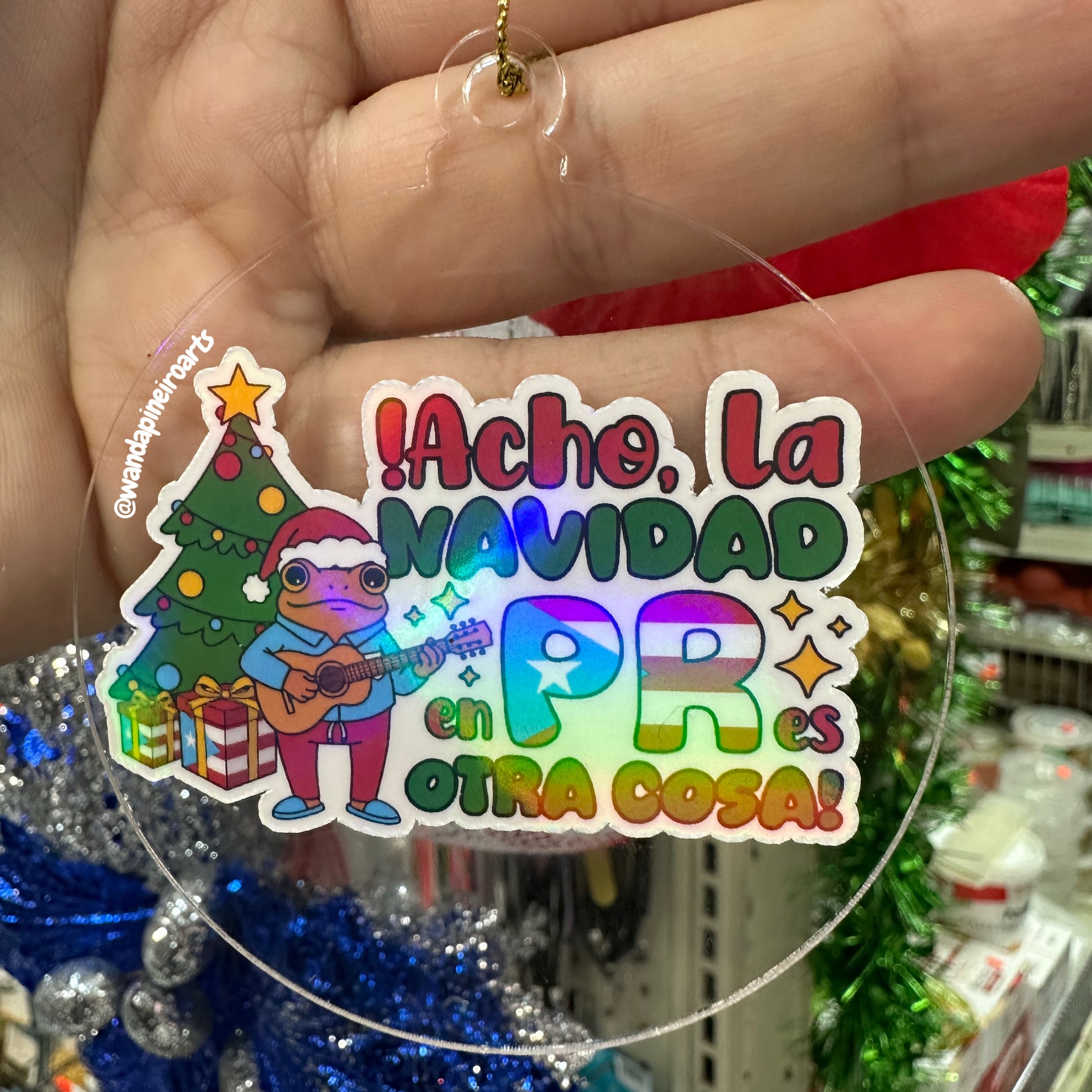 Hermoso ornamento en acrílico de 3” con frase “Acho la Navidad en PR es otra cosa”. Incluye cinta