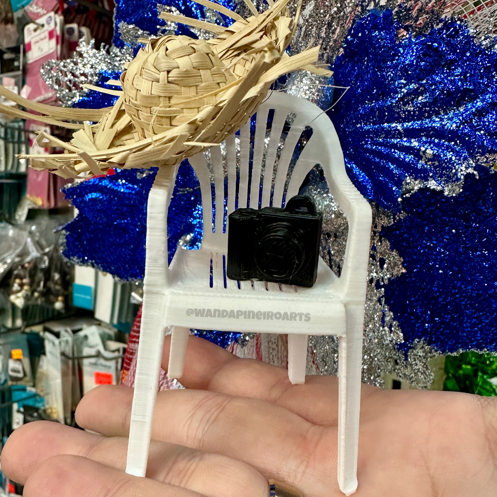 Silla plástica hecha en Puerto Rico con cámara y mini pavita ideal para decorar y obsequiarse en esta temporada navideña. Medida de pieza 4” aproximadamente