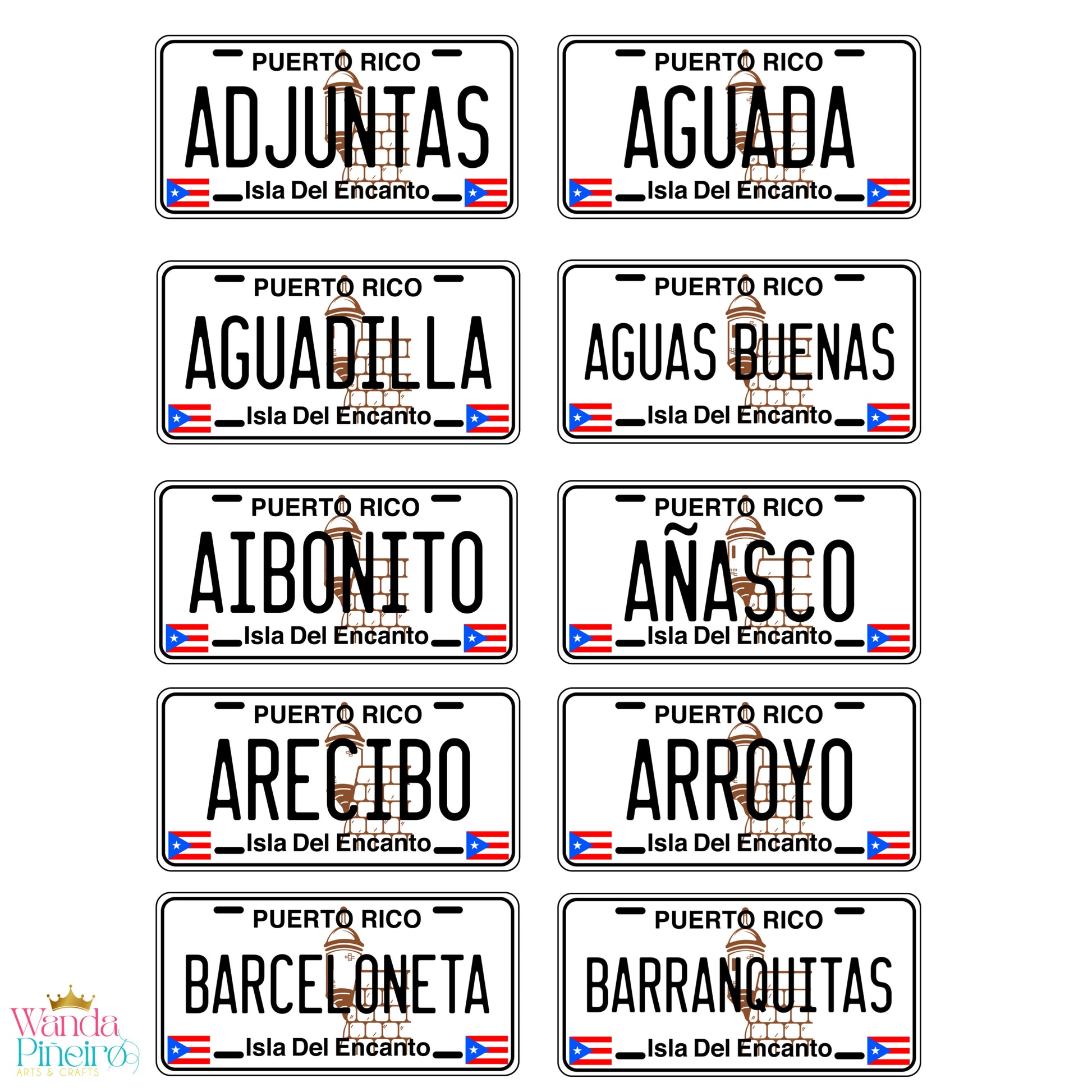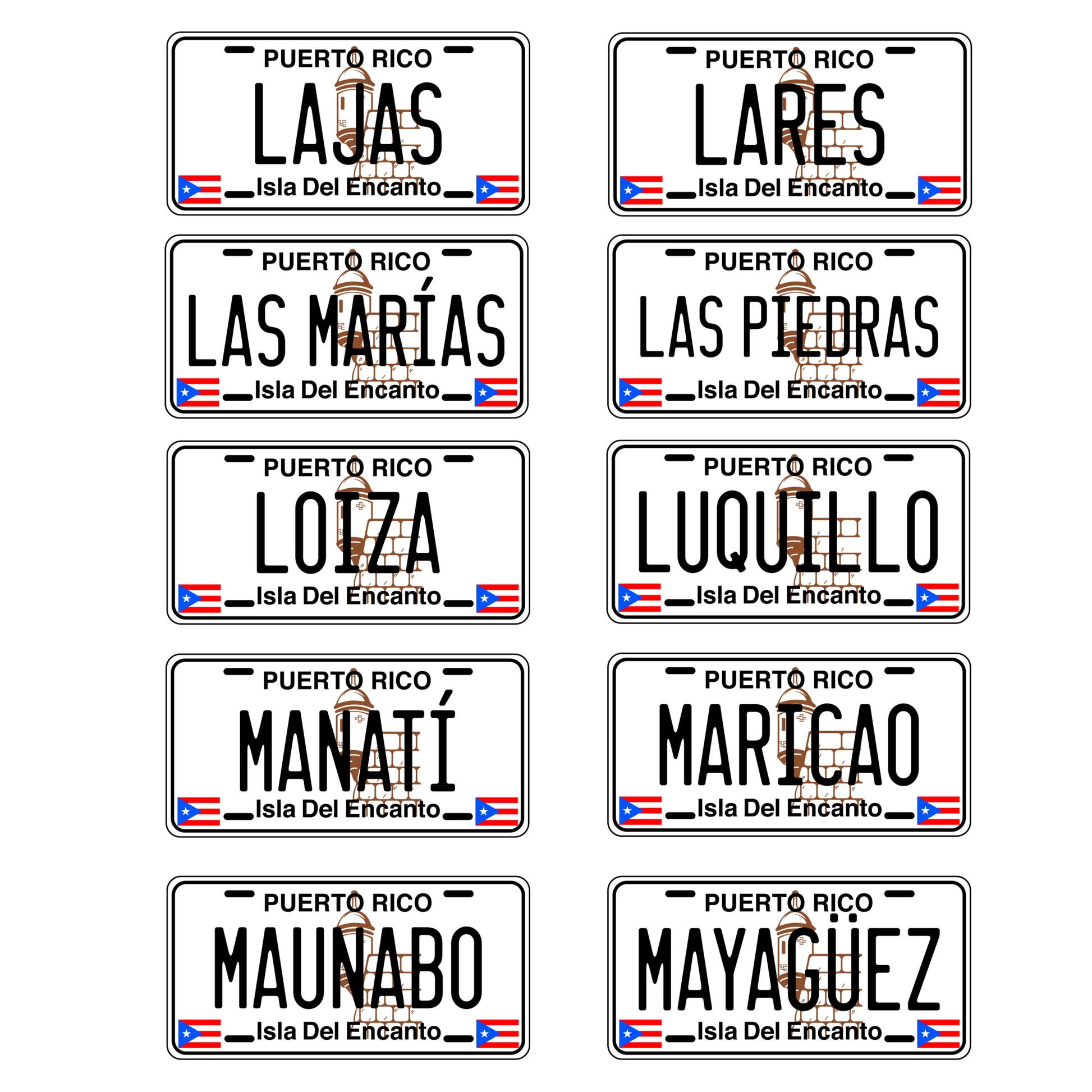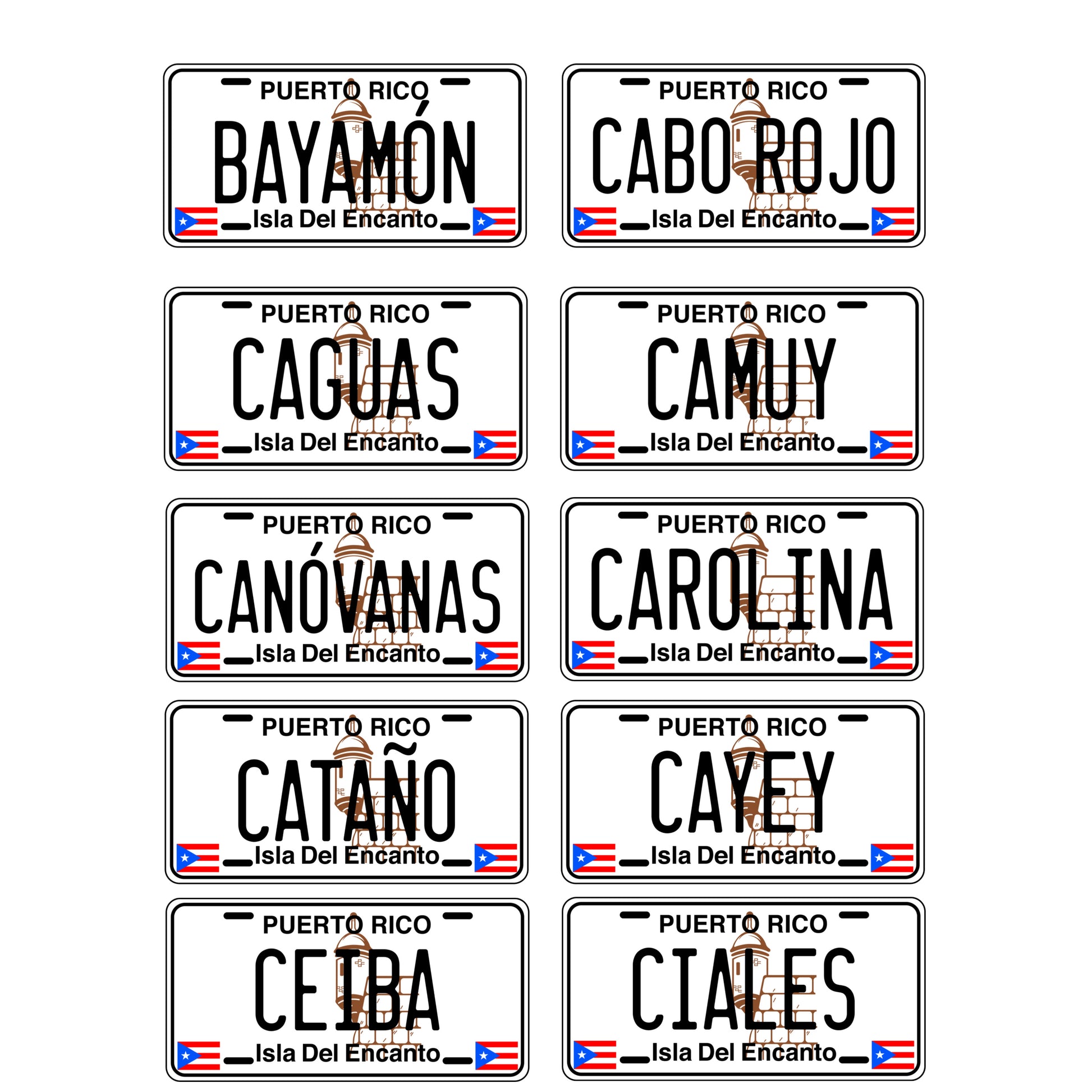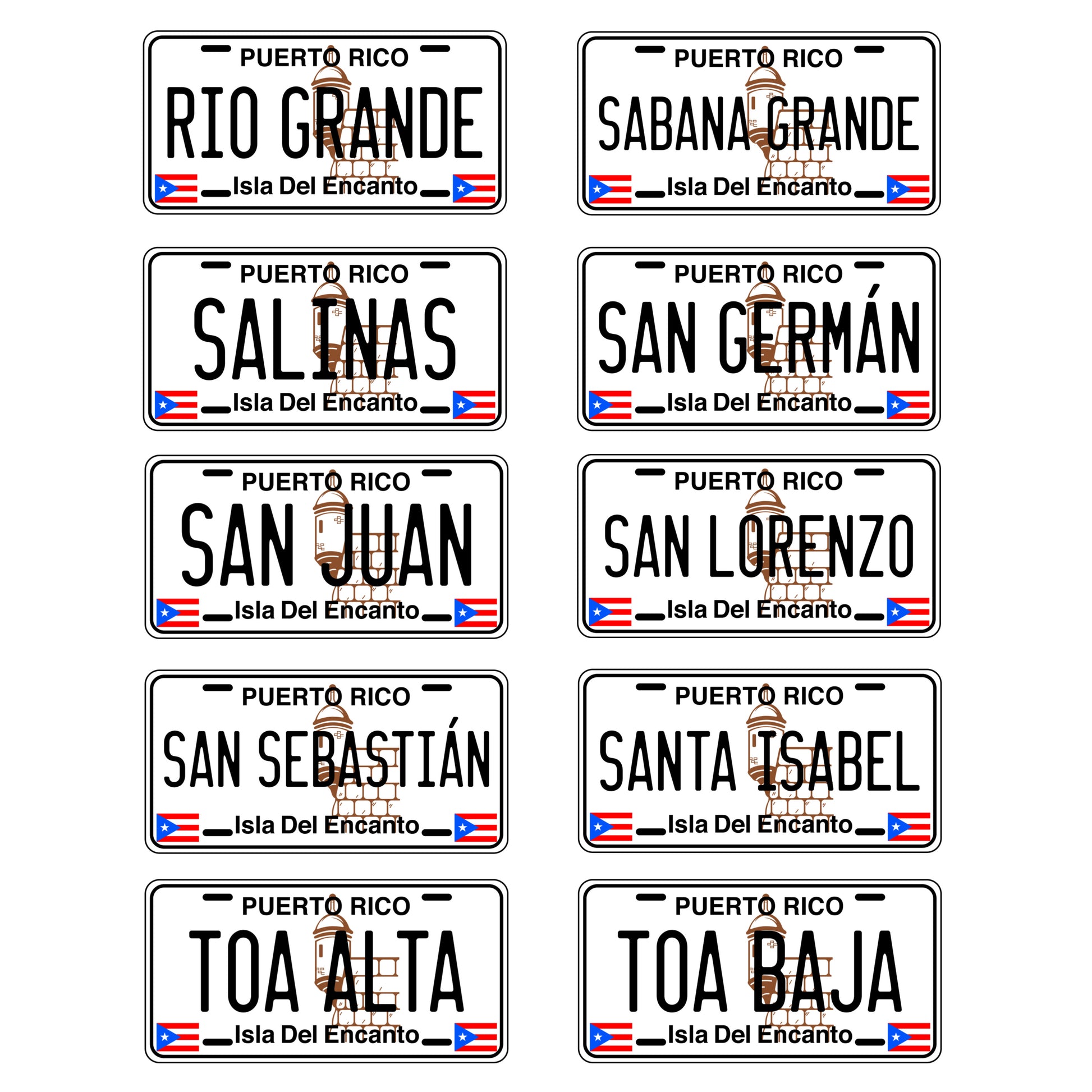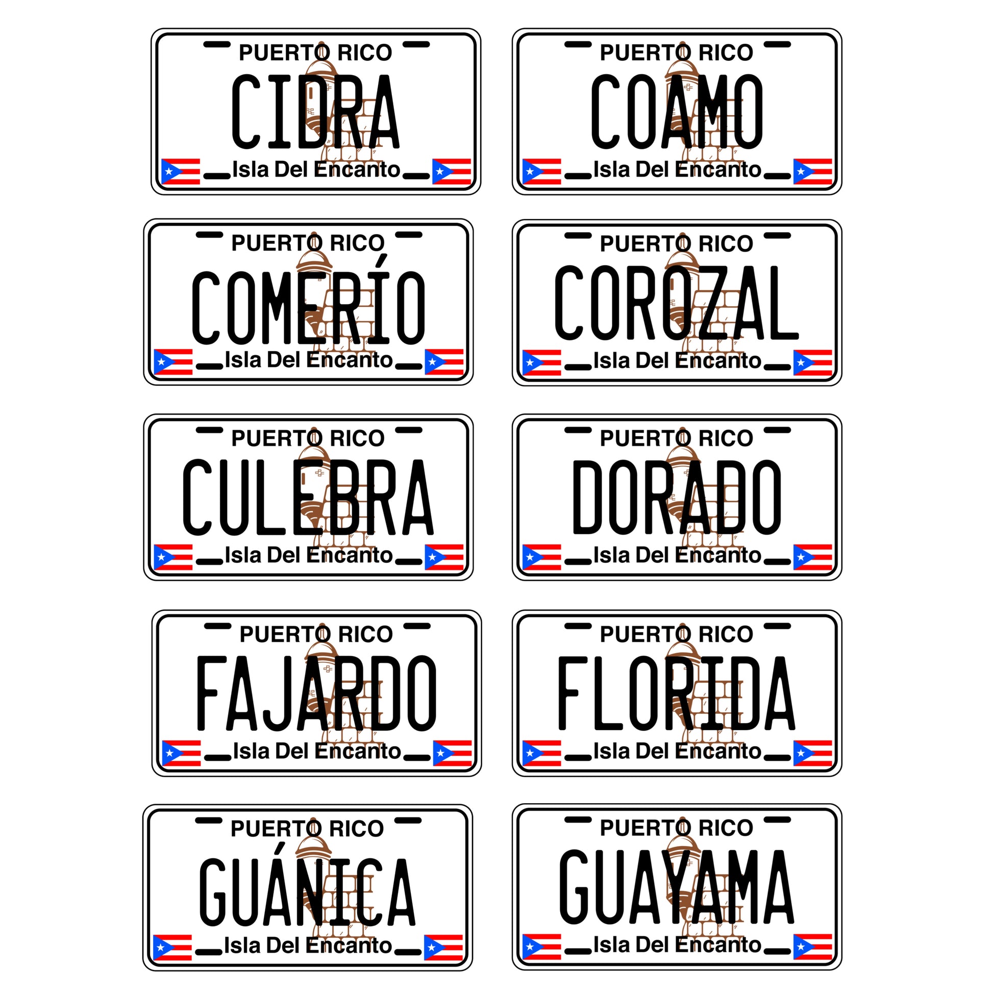 Stickers alusivo a tablilla de Puerto Rico con cada municipio. Medida aproximadamente 2.5” x 1.25”