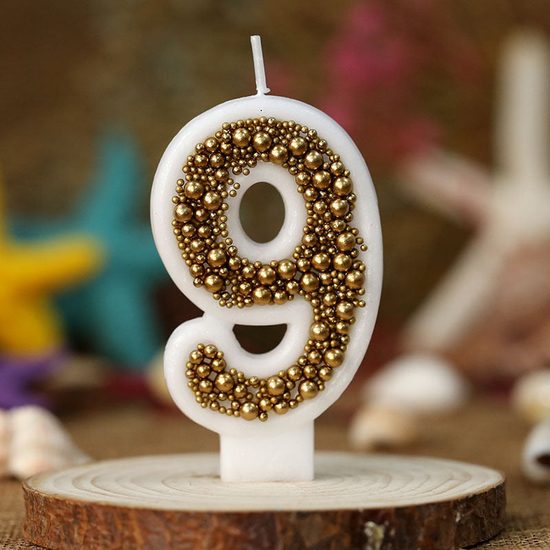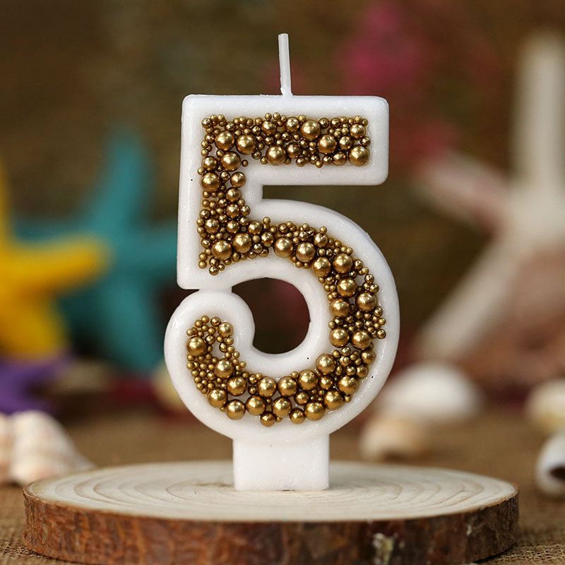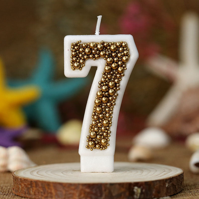 Vela de cumpleaños hecha a mano blanca con perlas en color oro